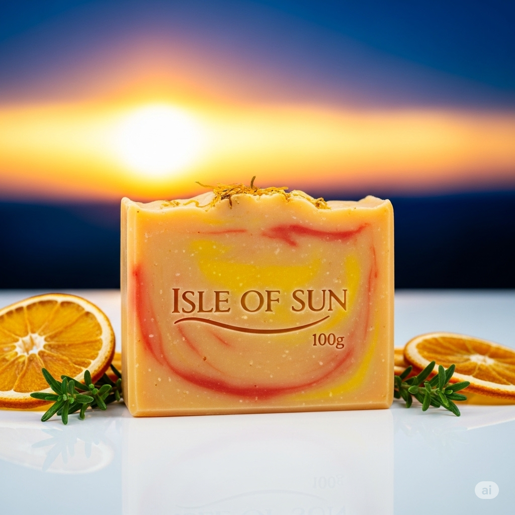 This handcrafted "Isle of Sun" soap is a 100g bar designed to evoke the warmth and energy of a tropical sunrise. Made with a nourishing coconut oil base, the soap features a vibrant and uplifting blend of yellow and orange swirls, reminiscent of a sun-kissed sky. The bar is topped with dried petals, adding a delicate, natural touch. Surrounded by dried orange slices and fresh herbs, the presentation highlights the soap's citrus and herbal notes. Ideal for a refreshing and energizing cleanse, this soap is perfect for an invigorating morning shower, leaving your skin feeling soft, moisturized, and beautifully scented.